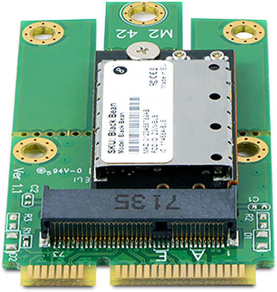 BLACK Bean is a high-performance and ultra-low-power surface-mount PCIe M.2 module built on the Qualcomm QCA9377-5 chipset. Its tiny form factor makes it easy to add single-stream 11ac Wave2 Wi-Fi and Bluetooth 5.0 to your project.