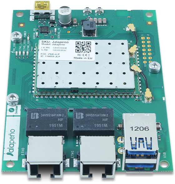 With dual-band concurrent Wi-Fi 5 capabilities, a powerful NEON media engine, and numerous hardware security measures, Jalapeno is the perfect choice for your full-featured connected project. Powered by the IPQ4018 SoC from Qualcomm. Software development options include OpenWrt™ with upstream support and FirmUx.